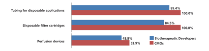 Figure 1: Usage of disposables in biopharmaceutical manufacturing, therapeutic developers vs contract manufacturing organizations (CMOs). Applications in biomanufacturing; % using single-use systems (SUS) products (selected data). (Figures courtesy of the authors)