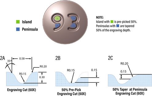 Figure 2. The risk of picking in an island or peninsula in a typical engraving cut (shown in 2A) can be reduced by decreasing the island depth using a pre-pick cut (2B) or by tapering (2C).