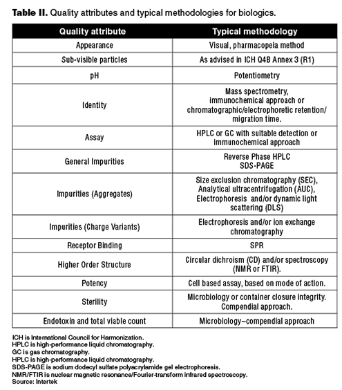 In comparison, for biologics, the nature of the stability testing to be included in any program differs, driven by the complexity of biologic molecule structure. In many ways, biologics require a more diverse analytical capability, according to Wake. Defining a typical stability testing protocol is consequently more difficult, but as a minimum would include assessment of the quality attributes shown in Table II.