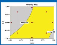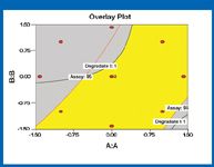 When there is more than one quality characteristic in the design space, the use of overlay plots is helpful. An overlay plot is created by superimposing the contour plots for each quality characteristic with the required quality bounds (e.g., specifications). A potential design space can often be found where all the mean quality characteristics are simultaneously within the requirements. Figure 8 provides a potential window of operability for Assay and Degradate 1. For this overlay plot, the requirements for assay are 95.0% to 105.0% and Degradate 1 is NMT 1.00%. The yellow region indicates the settings of Factors A and B that meet both of these requirements simultaneously. The red points included on the plot are the experimental design points; note that the axes extend from -1.5 to +1.5 coded units although the experimental space is from -1.41 to +1.41 coded units.