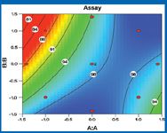 Figure 6: Assay contour plot shows the expected assay responses for different combinations of Factors A and B. Red points are the experimental design points; note that although the axes extend from â1.5 to +1.5 coded units, the experimental factors only spanned -1.41 to +1.41 coded units. Color is used to indicate the value of assay with red representing lower values and blue indicating higher values.
