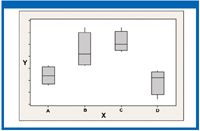 When X is categorical as shown in Figure 2, statistical intervals on the response are constructed for different values of the categorical factor. Figure 2 demonstrates a box–plot display of the response for each of the X values (A, B, C, D). Box plots summarize the data for each X value, showing the spread and center of the response at the value of X. The design space would include all the X values where the statistical limits on Y provide acceptable quality.