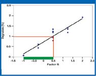 Figure 4 illustrates an example of an empirical model of Y on X. A linear regression equation is used to model how the level of a degradate changes with varying levels of Factor B. If the specification for degradate is not more than (NMT) 1.00%, then –1.00 to 0.49 may be defined as a design space for Factor B. This is shown as the green region in Figure 4. In this region, the predicted values from the regression equation meet specification. It should be noted that there is some uncertainty associated with the just defined area. Evaluation of the design space is discussed in Question 25, which will be covered in Part III of this series.