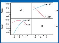Figure 5: Assay interaction profile depicting the interaction effect between Factors A and B on assay. The subgraph on the left shows how the assay (y-axis) changes from the low to high level of A (x-axis). The red line indicates the assay values for the low level of B (â1.41 coded units) and the blue line indicates assay values for the high level of B (1.41 coded units). The subgraph on the right shows levels of B on the x-axis and the low and high levels of A coded as red and blue lines. This subgraph provides insight into how assay is related to level of factor A and that this relationship is dependent on the level of factor B.