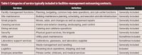 Facilities management is comprised of a broad range of activities ranging from utilities-plant maintenance, building maintenance, and engineering to mailroom operations. At research sites, the definition of facility management can also include laboratory-related services, such as glassware services, fume-hood maintenance, and some laboratory equipment calibration. Table I includes the broad categories of services that define how facilities management is being interpreted in the pharmaceutical industry and the services included in facilities-management outsourcing.