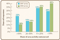 Survey results indicate that the growth in spending on outsourced activities reflects a fundamental move in favor of outsourcing rather than conducting activities in-house. Among biopharmaceutical and pharmaceutical company respondents, 27% reported that their spending on contract services is growing faster than their overall spending, up from just 18% of respondents in last year's survey (see Figure 2). More than 20% of respondents report that half or more of the spending in their particular area is outsourced, which is more than double the response from 2006 (see Figure 3). Here again, the results are consistent regardless of company size or activity (commercial versus development).