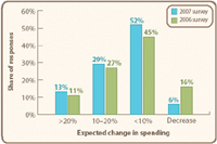 Given that context, we are inclined to temper our enthusiasm over the indications from this year's survey that 2008 should be another strong year for the industry. Among biopharmaceutical and pharmaceutical company respondents, 43% expect spending for contract services to grow by 10% or more next year, versus 36% in the 2006 survey; only 7% expect spending to decrease. Service providers are very optimistic as well: 80% expect 2008 to be better or much better than 2007. In 2006, only 55% had such expectations for the following year.