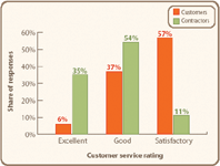 Our 2007 survey results suggest that the big jump in customer demand is really straining contractor capacity. This is especially true for basic infrastructure capabilities such as customer service and project management. Service providers themselves admit that rapid growth is causing strains. More than 50% indicate that a lack of capacity is constraining their ability to take on new business. Many of their customers have noticed that as well: 30% say that contractors appear to have all the work they can handle.