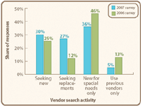 The growth in spending has created a more fluid contract services market that offers more opportunities for service providers. In this year's survey, 57% of biopharmaceutical and pharmaceutical company respondents report that they are actively looking for new service providers, either to increase their vendor base or to replace current providers; that value is up from 37% in 2006 (see Figure 5). The number of respondents who are unwilling to look beyond their current provider base dropped by two-thirds: only 5% of respondents say they use only current vendors.