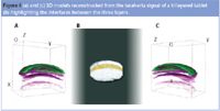 Figure 4 (a) and (c) 3D models reconstructed from the terahertz signal of a trilayered tablet (b) highlighting the interfaces between the three layers.