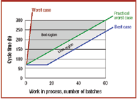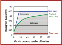 Although the term "practical worst case" may sound extreme, the lines actually determine the division that distinguishes good performance from bad (hence, the term "marginal case"). Best-case, worst-case, and practical worst-case performances can be shown graphically. The relationship of work in process and cycle time is shown in Figure 1. The relationship between work in process and throughput is shown in Figure 2. In Figure 1, the space between the worst-case line and the practical worst-case line is considered the bad region. A factory should not operate in this area. The space between the practical worst-case line and the best-case line is the good region, and can be considered the area of lean manufacturing. In Figure 2, the area above the practical worst-case curve is considered good, or the lean region. Operation below the practical worst-case line is considered inefficient (13).