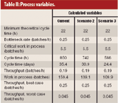 Savings. What is this worth? Inventory is saved. At a minimum, in-process inventory is reduced because high-value drug active is transformed from raw material to shippable product faster. For a product that has $400-million sales per year, a 30% improvement in work in process (the difference between the current operation and scenario 3) is noteworthy. Decreasing the cycle time from 35 to 24 days saves 11 days of inventory.