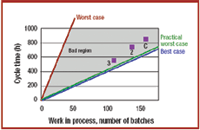 The impact of work in process on cycle time is shown in Figure 5 (Table II data). The results for the current operation are shown as point C. As with the throughput graph, the operation is in the bad region, primarily because work in process inventories are so high. A decrease in work in process would improve cycle times by decreasing the amount of time that inventory sits idle.
