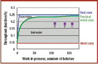 The throughput graph and the cycle time graph complete the picture. Figure 4 (Table II data) shows the throughput graph, with the current operation's results shown as point C. The process lies deep within the bad region; this is not a lean operation. Although the process is not approaching a worst case, it is far from the lean operating region. From a throughput perspective, the process is currently operating with too much work in process. Too much material is sitting idly in inventory, waiting for further processing.