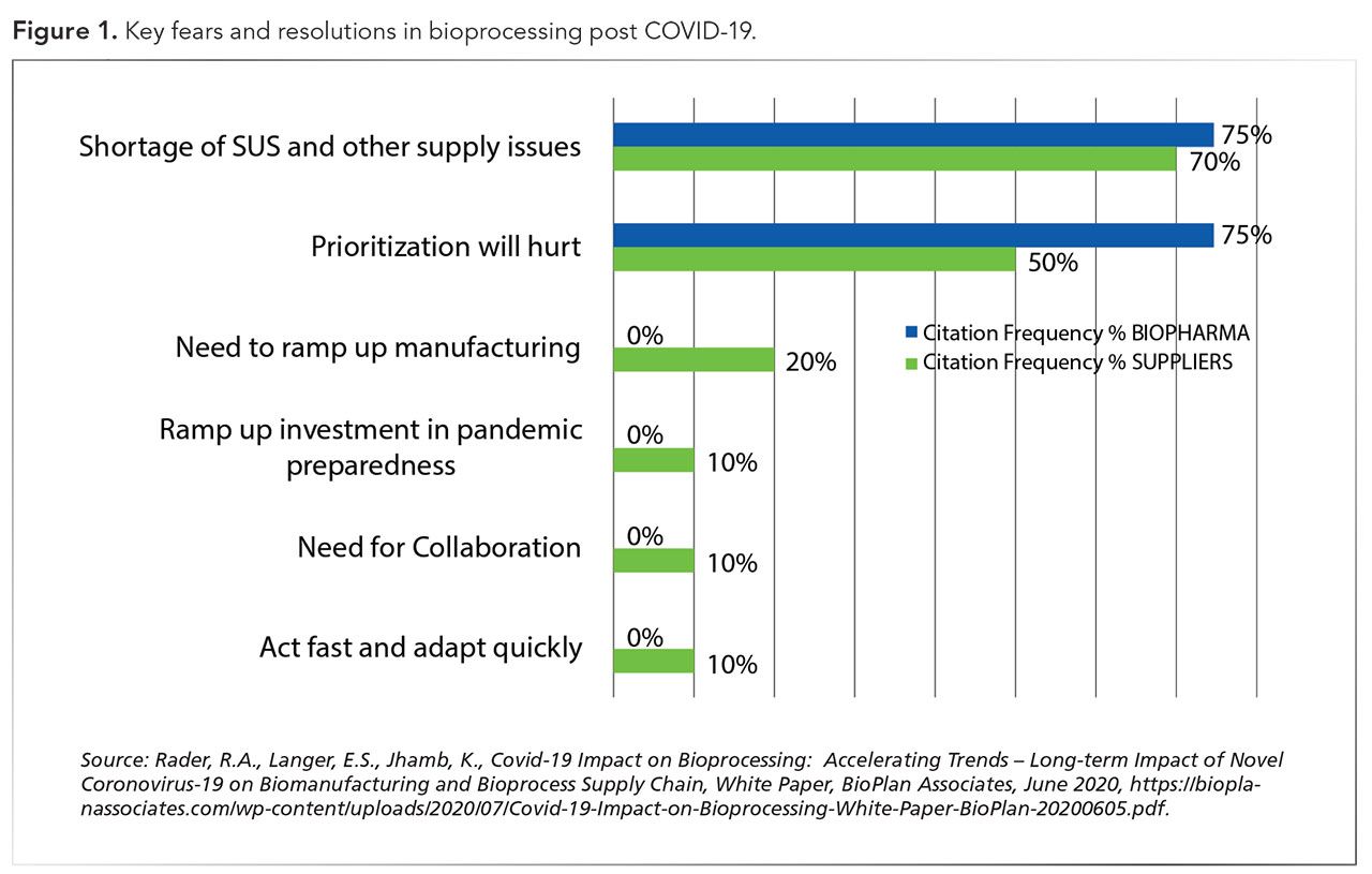 A new landscape is evolving for what bioprocessing will look like post COVID-19. Figure 1 summarizes results from interviews with product developer and bioprocessing supplier company executives regarding expectations for the impacts of the COVID-19 pandemic on the bioprocessing landscape, post pandemic.
