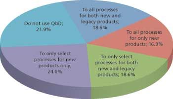 The majority of respondents use QbD principles in their manufacturing processes to some extent (see Figure 3). Approximately 35% apply QbD to all processes for new or all products, and nearly 43% apply QbD to select processes. Almost 22% indicated that they do not use QbD principles. Respondents noted several different challenges to implementing or barriers to using QbD (multiple answers allowed). The challenge most frequently identified was lack of knowledge or training (nearly 60% of respondents). Other challenges included lack of clarity in regulatory guidance (40%), management buy-in (38%), and availability of necessary equipment (35%) and software tools (31%). Nearly 10% said they saw no barriers or challenges.