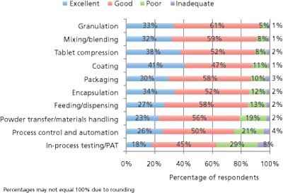 Existing solid-dosage equipment is generally meeting industry needs. Only one area—PAT/in-process testing—was indicated as poor or inadequate by more than one-third of respondents (see Figure 1). Nearly one quarter of respondents also indicated that innovation is lacking in this area. This dissatisfaction is up from 2013, in which 22% indicated existing equipment was poor or inadequate and 16% said innovation was poor (1). It is interesting to note that use of PAT also increased over the past year among those surveyed. Process control/automation and powder transfer/materials handling were also flagged as needing significant improvement in existing equipment (25% and 21% respectively) and in innovation (17% and 12%); these areas were also noted in 2013.