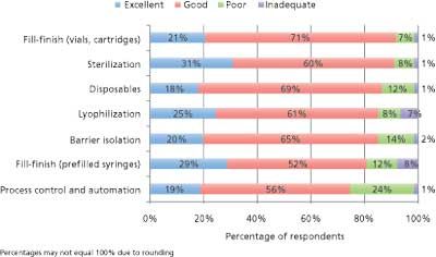 The majority of parenteral-equipment respondents indicated that existing equipment is good or excellent, as shown in Figure 2. These respondents also agreed that innovation is generally keeping pace with most, if not all, of their needs. Innovation was rated as excellent or good in lyophilization (95%), barrier isolation (91%), disposables (91%), vial and cartridge fill-finish equipment (92%), and prefilled-syringe fill-finish equipment (85%). Process control and automation was a weaker area, similar to 2013, with approximately 25% saying that existing equipment is either poor or inadequate, and 18% saying that innovation is poor.