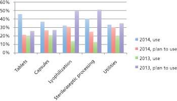In the five manufacturing areas surveyed, the use of PAT increased significantly since 2013 (see Figure 4), with 32-46% of respondents in 2014 indicating that they currently use PAT compared to 13-21% of respondents in 2013 (1). The primary drivers for using PAT (multiple answers possible) include better process understanding (56%), increased efficiency (39%), reduced costs (34%), and shorter process times (30%). The use of PAT should continue to grow; between 20 and 30% of respondents in 2014 indicate plans to implement PAT in the coming year. Approximately one-third of respondents (33-37% depending on the application), however, do not currently use PAT and do not plan to implement it in the coming year.