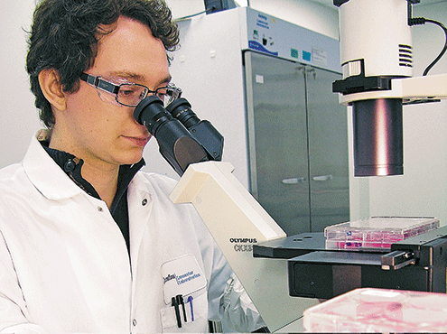 Figure 1: An analyst (Eurofins Lancaster Laboratories) observes cells for cytopathology caused by the presence of adventitious agents.