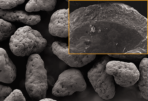 Figure 1. Scanning electron microscope image of particles coated with a mixture of lipids using hot melt coating (insert: enlargement of a cross-sectioned particle). [All figures are courtesy of the author]