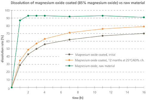 Figure 2. Release profiles comparing coated magnesium oxide (85 percent magnesium oxide) with the raw material. The release profile of the coated product stored for 12 months at 25 degreesC and 60 percent relative humidity is also shown. Hot melt coating was used to create the extended release characteristics. Dissolution testing was performed using the USP II (paddle) apparatus at 75 rpm and in 900 mL 0.1 M hydrochloric acid at 37 degrees C.