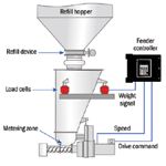 A loss-in-weight feeder consists of a hopper and feeder that are isolated from the process, so the entire system can be continuously weighed. As the feeder discharges material, system weight declines. The speed of the metering device is controlled to result in a per-unit-time loss of system weight equal to the desired feed rate. A typical loss-in-weight feeder controller adjusts feeder speed to produce a rate of weight loss equal to the desired feed-rate setpoint.