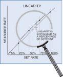 A feeder's linearity measurement quantifies how well or poorly it delivers the desired average rate at each of various points throughout the feeder's complete operating range. Perfect linearity is represented by a straight-line relationship between the setpoint and the actual average feed rate throughout the feeder's specified turndown range from its design, full-scale operating range.