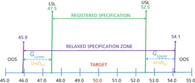 In other words, a registered specification of 47.5 to 52.5 needs to be extended to 46.7 to 53.3 to take into account the metrological uncertainty at 95% confidence. If reportable values fall between the upper registered specification limit (USL)