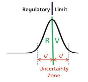 It is necessary to evaluate a reportable value at or close to a regulatory or specification limit in terms of the inherent measurement uncertainty. The concept was explored in more detail in a previous paper (1) and is summarized in Figure 1.