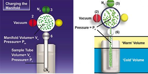 The sample tube is then isolated from the manifold and submerged in a cold bath containing liquid nitrogen (LN2). Charging the manifold to a certain pressure admits a quantity of gas that can be calculated from the gas law, and the manifold is then opened up to the sample to allow gas adsorption (see Figure 1).