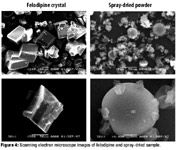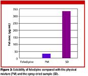 The formation of a solid glassy solution leads increases the dissolution rate and apparent solubility of felodipine. In Figure 3, the solubility of the spray-dried sample is compared with the solubility of pure felodipine and the physical mixture. For felodipine, no solubility was detected because the value was below the detection limit. The physical mixture increased in solubility (40 µg/mL), because of to the wetting properties of Eudragit. The spray-dried sample increased the solubility of felodipine 8.5-fold to 340 µg/mL. This tremendous increase in solubility is caused by the formation of a solid dispersion. In Figure 4, the SEM picture of pure felodipine and the spray-dried powder can be seen. Pure felodipine appears as cubic crystals; in the spray-dried powder, no felodipine crystals are observed.