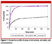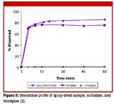 In Figure 5, the dissolution profiles of the extrudate and the spray-dried powder are compared with those of pure felodipine in acidic media. Dissolution of extrudates was described in a previous study (4) and is used for comparison with the spray-dried sample. Crystalline felodipine, as expected, shows nearly no dissolution because its solubility in 0.1N hydrochlorid acid (pH 1.2) is very poor (1 mg/mL).