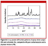 Spray-drying and melt extrusion with carbamazepine. Spray-dried and melt-extruded samples containing Eudragit NE 30D E and carbamazepine were analyzed with XRPD and dissolution testing. Neither samples exhibited crystalline peaks in XRPD analysis (see Figure 6), thereby showing that an amorphous state of carbamazepine is likely. For the pure carbamazepine, crystalline peaks were observed corresponding to the polymorphic modification stable at room temperature. The physical mixture also showed crystalline peaks at 13.14(2θ), 15.36(2θ), 15.94(2θ), 17.18(2θ), 19.6(2θ), 25.02(2θ), and 27.42(2θ), corresponding to carbamazepine crystal of modification 3.