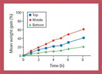 Figure 3: Moisture gain by ethambutol hydrochloride when stored in an open beaker at the top, middle, and bottom shelf slots. The beaker was placed at the same location on the shelf each time. The weight gain was monitored for 8 h.