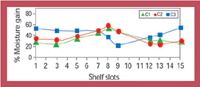 Figure 7: Moisture gain by ethambutol hydrochloride after 8 h, after storage at three central locations (C1â3) on 15 different shelf slots.