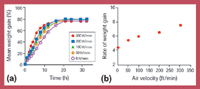 Figure 4: The influence of air velocity on moisture gain by ethambutol hydrochloride. Figure 4a shows the moisture-gain profiles, and Figure 4b shows a plot of the rate of moisture-gain versus air velocity.