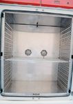 Interior layout of the chamber. The stability chamber's interior design is shown in Figure 1. Figure 1a shows a front view of the chamber, highlighting the presence of two fans on the rear wall. Figure 1b shows air-entry slits and slots for the shelves on the interior side wall of the chamber. Air-entry points also were present on the right side of the chamber. In total, there were 15 shelf slots. Air-entry points were present at shelf slots 2–7 and 9–12 and absent from shelf slots 1, 8, and 13–15.
