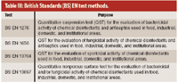 As a result of the CEN TC 216 work program, and with the concurrence of the EU Biocides Directive, several BS EN (European Standards as adopted by the British Standards Institute, test methods have been issued. These pass–fail test methods detail how disinfectants should be tested against selected cultures under controlled laboratory conditions. They also require an evaluation of the laboratory test results against field test results (see Table III).