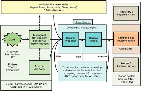 The critical question that must be asked is: what is necessary for compendial compliance? The answer is provided in an article describing the bio/pharmaceutical industry’s pharmacopoeial surveillance process (1): a company must comply with current pharmacopoeia requirements. This was true when the article was written 15 years ago and is still true today. Ongoing compliance requires timely and effective monitoring of pharmacopoeia publications (including both proposed and official changes) and implementation of these changes in the impacted quality, regulatory, and site/functional area procedures and documents. While this represents the essential compliance perspective, it does not adequately capture the totality of work that is typically required for the compendial affairs function within a given bio/pharmaceutical company. A comprehensive view of these activities can be found through an end-to-end consideration of compendial affairs.